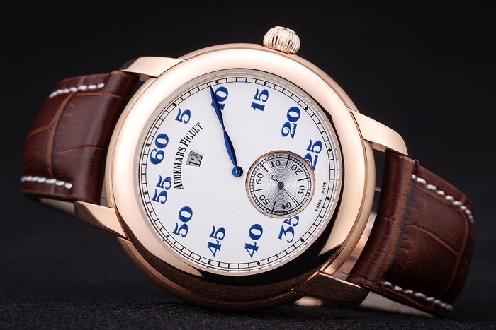 Bracelet: Brown crocodile leather strap with white thread stitching and heat embossed Audemars Piguet name and logo and an Audemars Piguet inscribed 18k rose-gold plated flip-over hook clasp