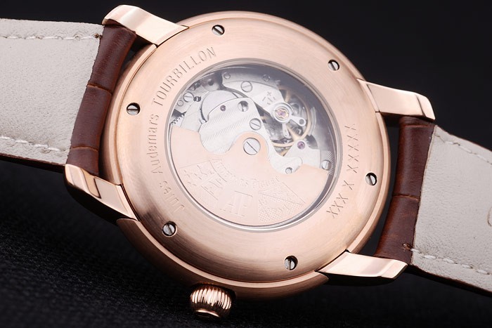 Back: 18k rose-gold plated screwed down back with a mechanics revealing transparent center and Jules Audemars Tourbillon engravings