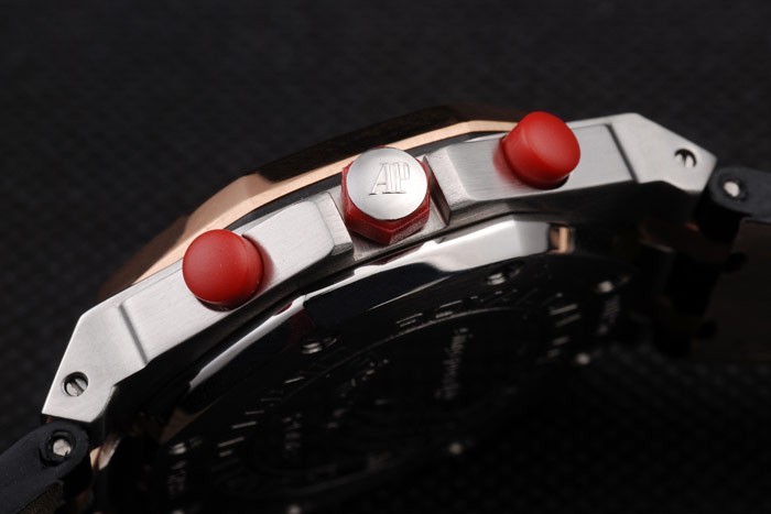 Crown: Red rubber hexagonal crown with the initials AP on stainless steel stud plus a red round rubber crown on either side of it