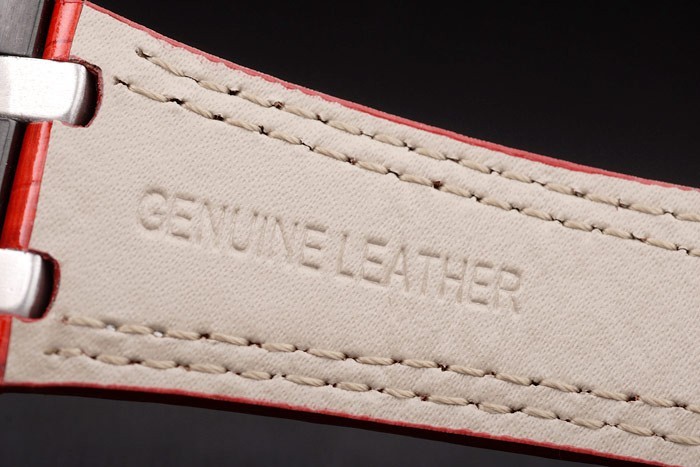 Bracelet: Heat embossed Audemars Piguet red crocodile leather strap with double white stitching and Audemars Piguet engraved ion-plated fold-in clasp