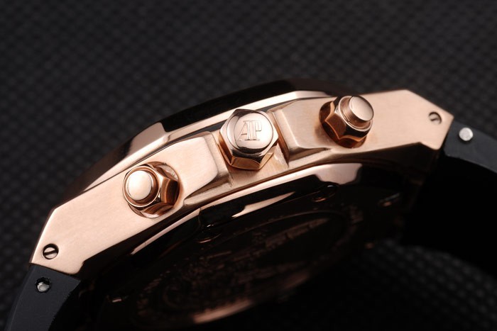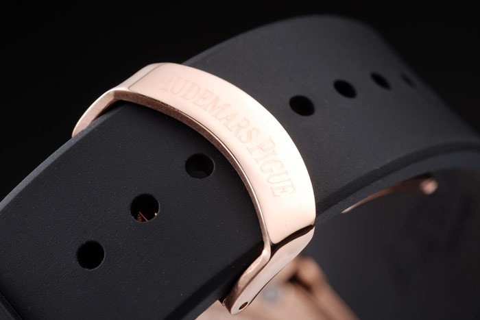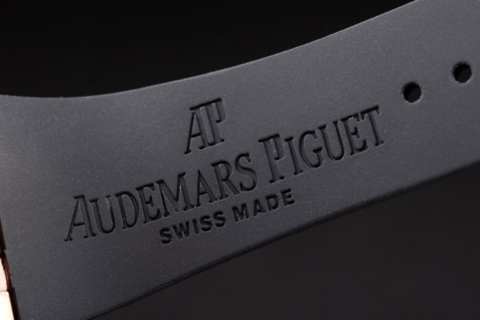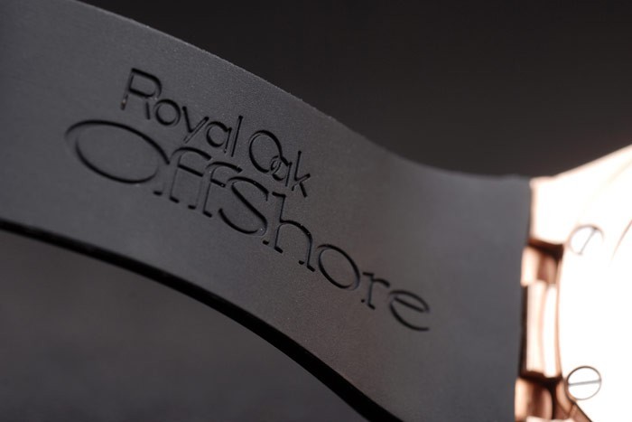 Bracelet: Audemars Piguet Royal Oak Offshore embossed black rubber strap with Audemars Piguet engraved Rose- gold fold-in clasp
