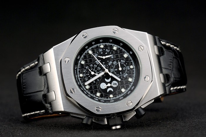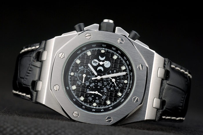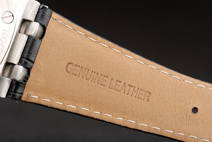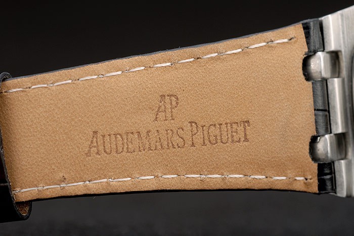 Bracelet: Audemars Piguet heat embossed black crocodile leather strap with Audemars Piguet engraved polished stainless steel hook hidden clasp