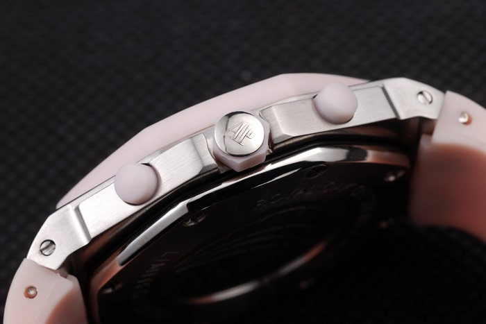 Crown: pink rubber hexagonal crown with the initials AP on stainless steel stud plus a pink round rubber crown on either side of it
