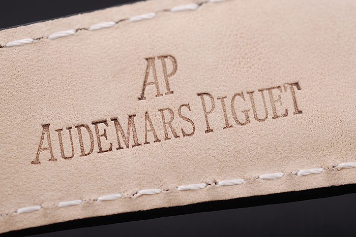 Bracelet: Black crocodile leather strap with white thread stitching and heat embossed Audemars Piguet name and logo and an Audemars Piguet inscribed ion-plated flip-over hook clasp