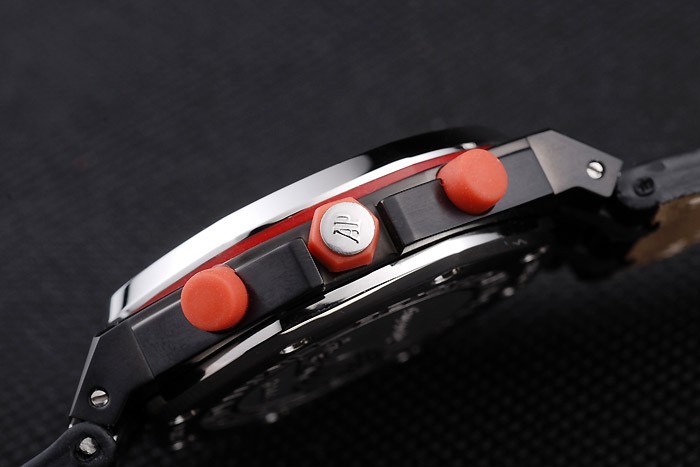 Crown: Red rubber hexagonal crown with the initials AP on stainless steel stud plus a red round rubber crown on either side of it