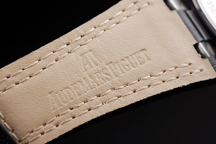 Bracelet: Heat embossed Audemars Piguet black crocodile leather strap with double white stitching and Audemars Piguet engraved stainless steel fold-in clasp