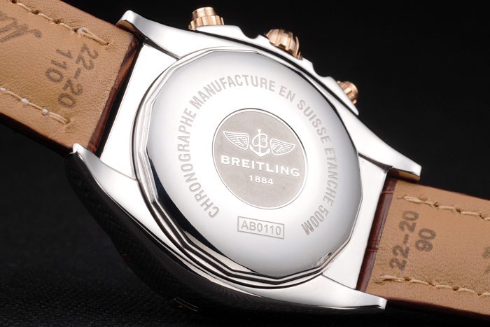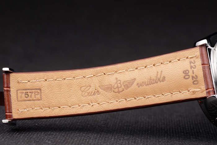 Bracelet: Brown crocodile leather strap with patent white stitching and heat embossed Breitling engravings and engraved stainless steel fold in clasp with Breitling logo on top