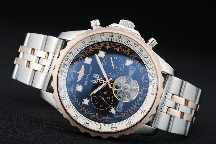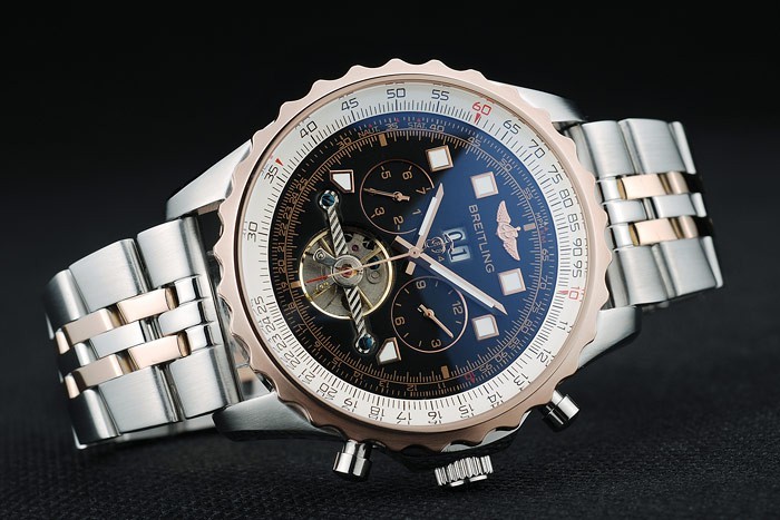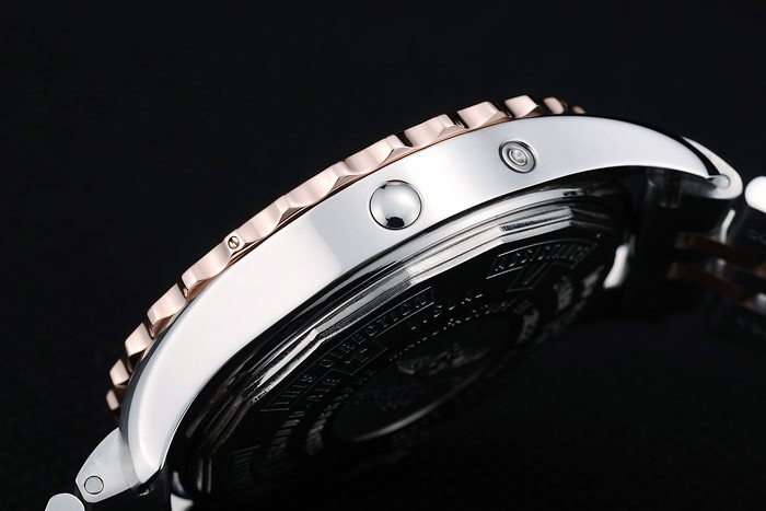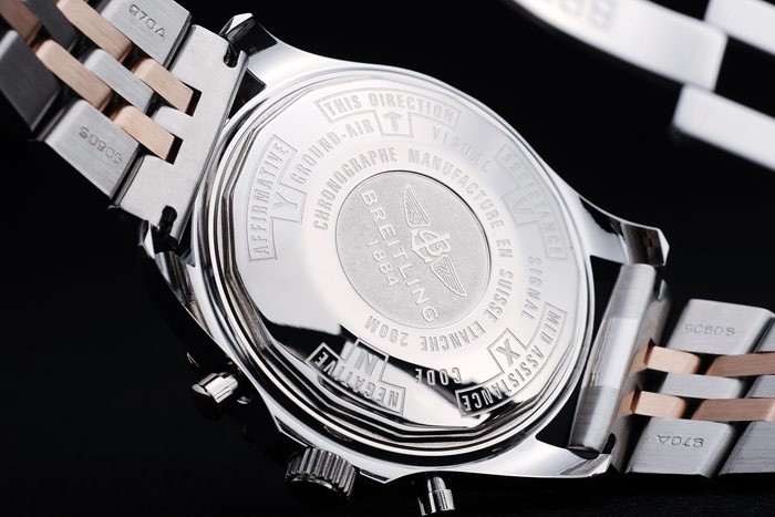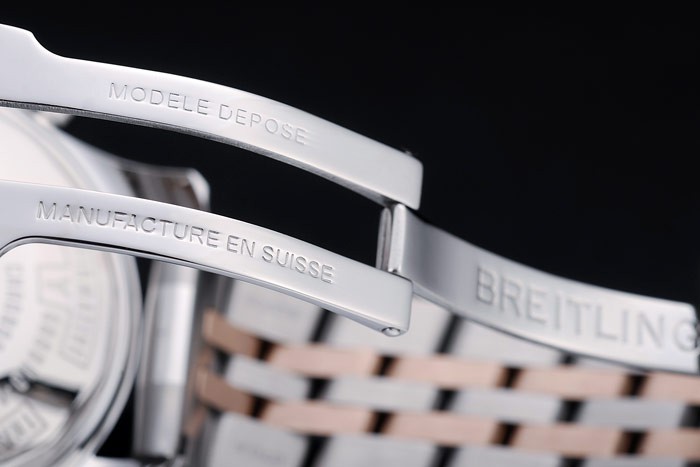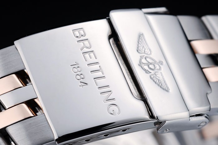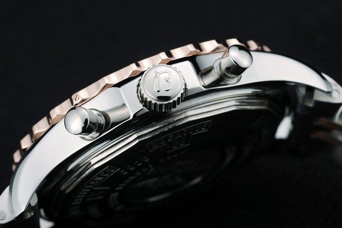 Crown: Polished stainless steel cutwork crown with Breitling logo and two smaller stainless steel push-button crowns on either side of it