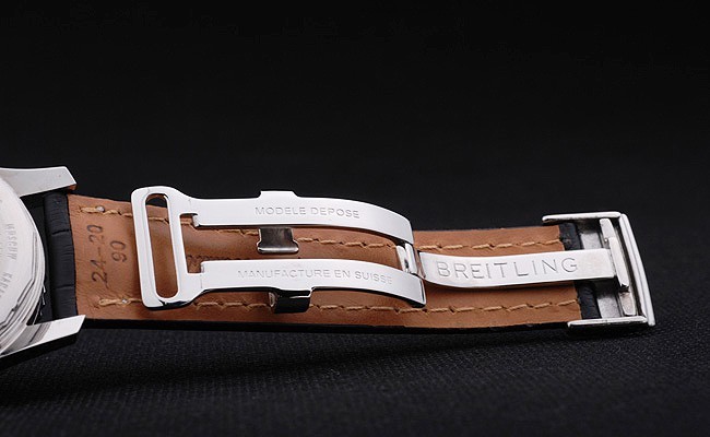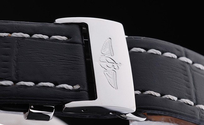 Bracelet: Black crocodile leather strap with patent white stitching and heat embossed Breitling engravings and engraved stainless steel fold in clasp with Breitling logo on top