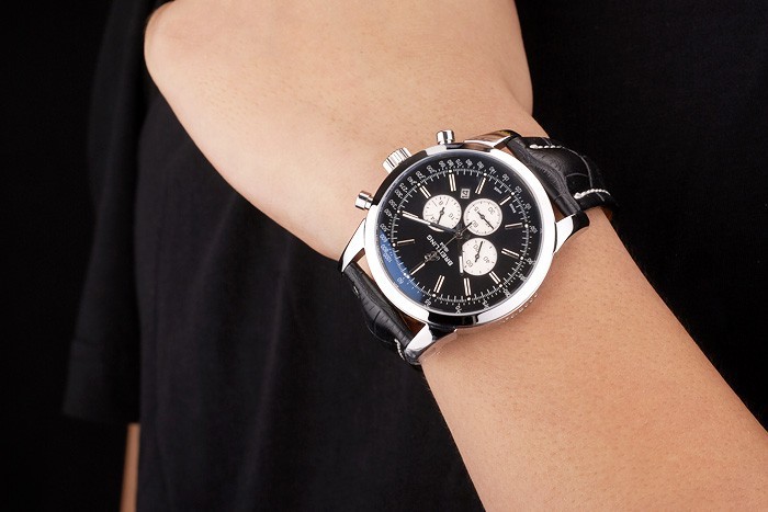 Bracelet: Heat embossed Breitling black crocodile leather strap with white thread stitching and a Breitling logo engraved fold-in stainless clasp