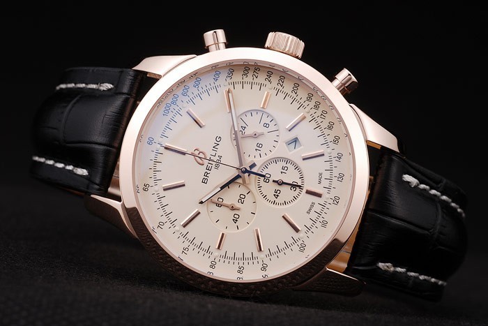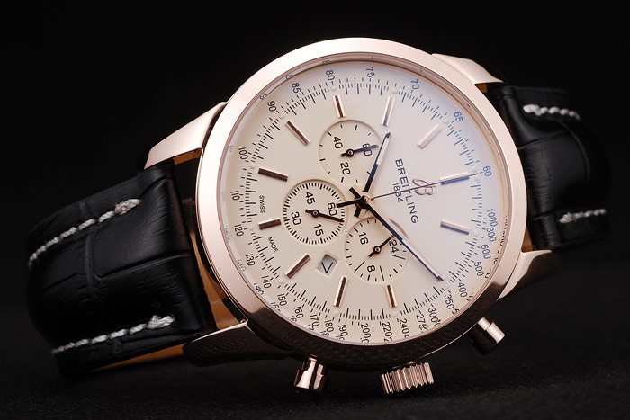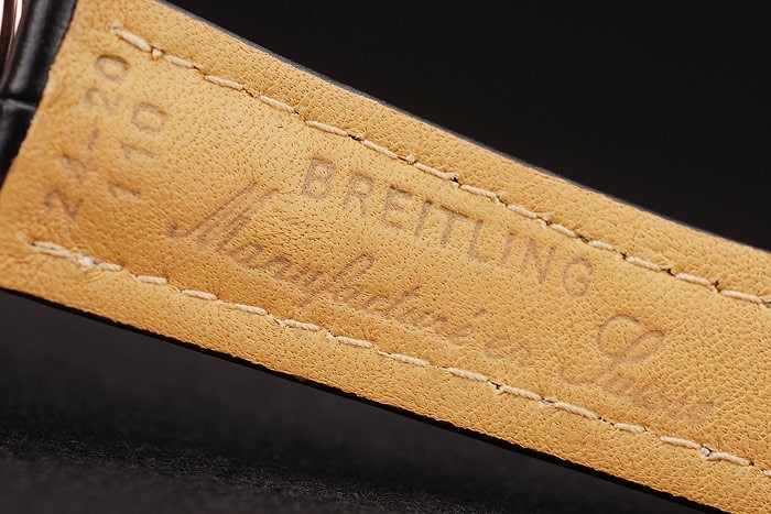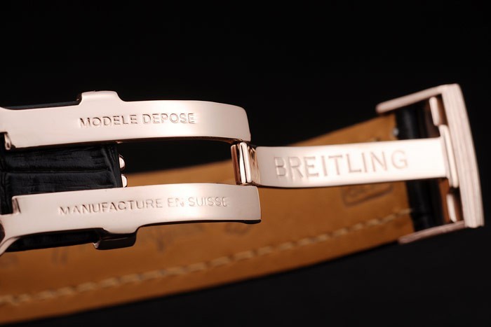 Bracelet: Heat embossed Breitling black crocodile leather strap with white thread stitching and a Breitling logo engraved fold- in rose-gold plated clasp