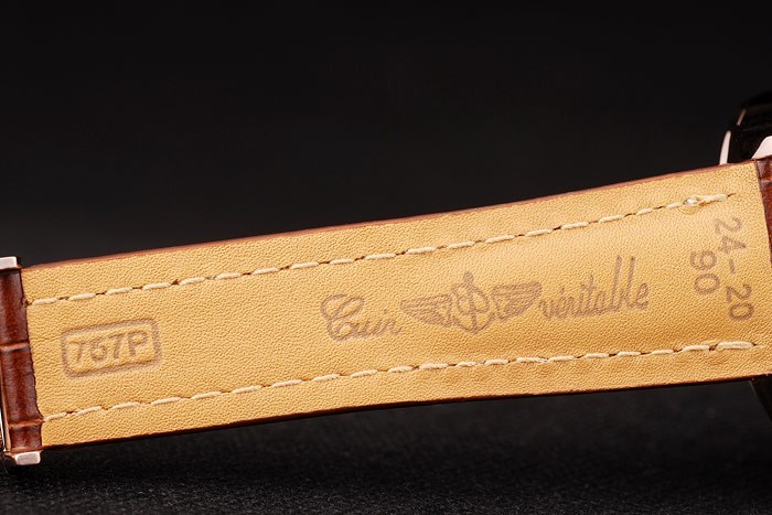 Bracelet: Heat embossed Breitling brown crocodile leather strap with white thread stitching and a Breitling logo engraved fold- in rose-gold plated clasp
