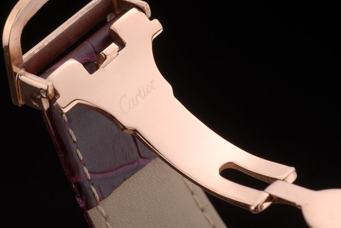 Bracelet: Cartier heat embossed purple crocodile leather strap with 18k rose-gold plated fold-in clasp buckle