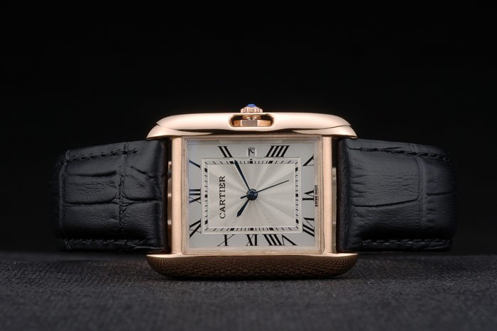 Bracelet: Cartier heat embossed black crocodile leather strap with 18k rose-gold plated fold-in clasp buckle