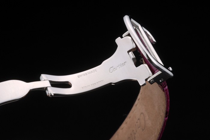 Bracelet: Cartier heat embossed purple crocodile leather strap with polished stainless steel fold-in clasp buckle