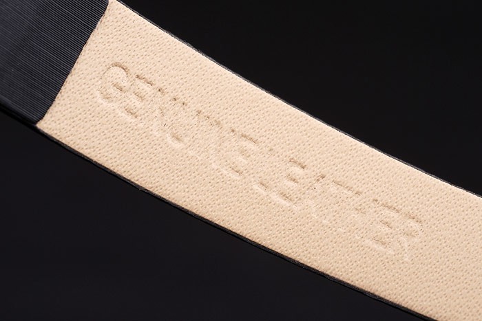 Bracelet: Heat embossed Cartier black textured leather strap with Cartier inscribed polished stainless steel fold-in flip clasp