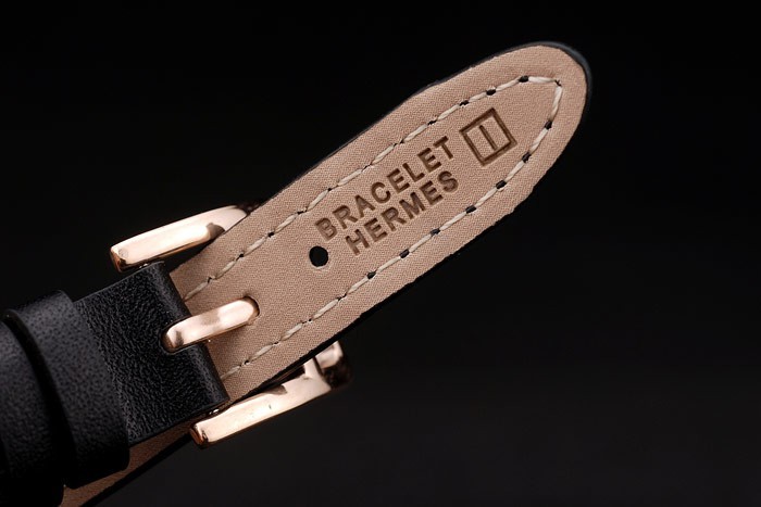 Bracelet: Elongated black leather strap with heat embossed stamp and Hermes Hermes Bracelet engraved rose-gold plated hook-buckle clasp