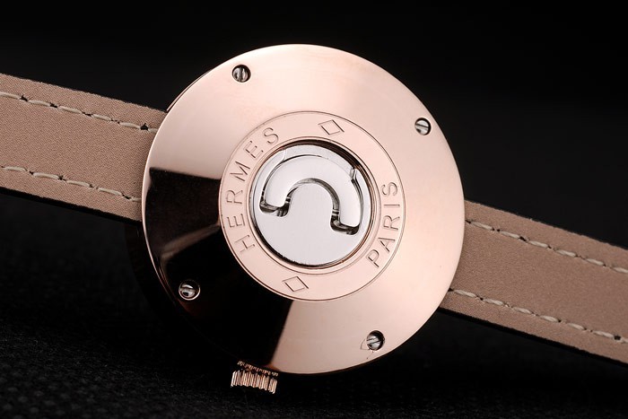 Back: Rose-gold plated screwed down back with stainless steel center and Hermes Paris engraving