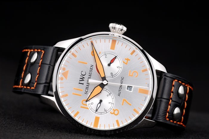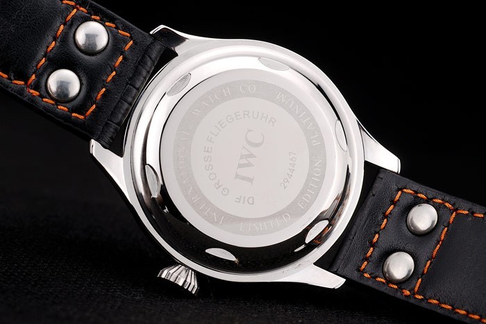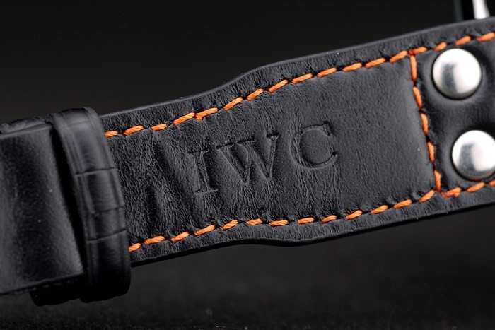 Bracelet: IWC heat embossed black crocodile leather strap with orange stitching thread and engraved brushed stainless steel hook-IWC clasp