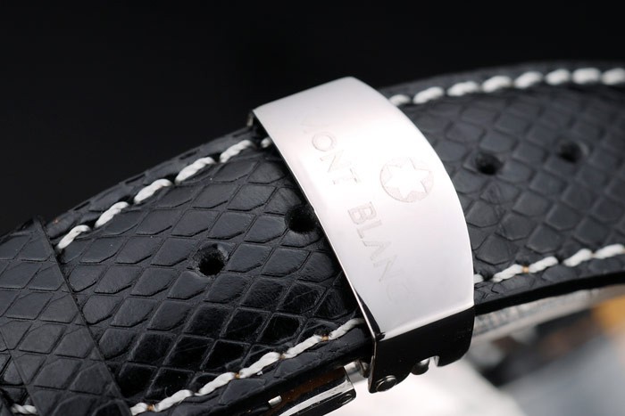 Bracelet: MontBlanc heat embossed black snakeskin leather strap with white thread stitching and polished stainless steel hidden clasp