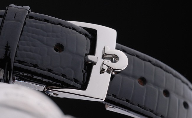 Bracelet: Patent black snake leather strap with heat embossed Omega stamp and thickly highlighted Omega logo hook-buckle stainless clasp