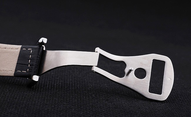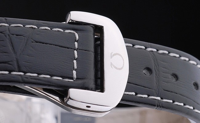 Bracelet: Black crocodile leather strap with white stitching and Omega logo engraved stainless steel hook-buckle clasp