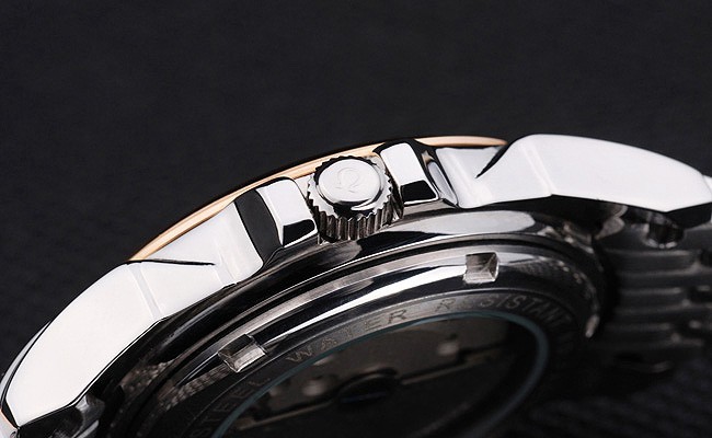 Crown: Polished stainless steel cutwork crown with Omega logo