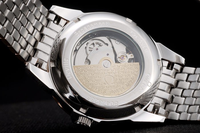 Back: Stainless steel push-in case back with Omega inscriptions and transparent center Reveals That the mechanics within