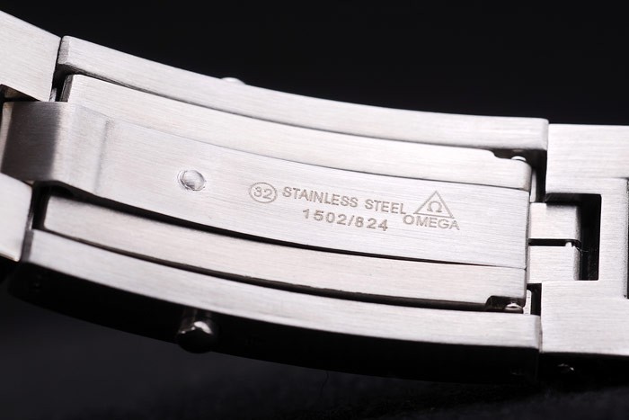 Crown: Polished stainless steel cutwork crown with Omega logo plus another similar crown on the opposite top corner