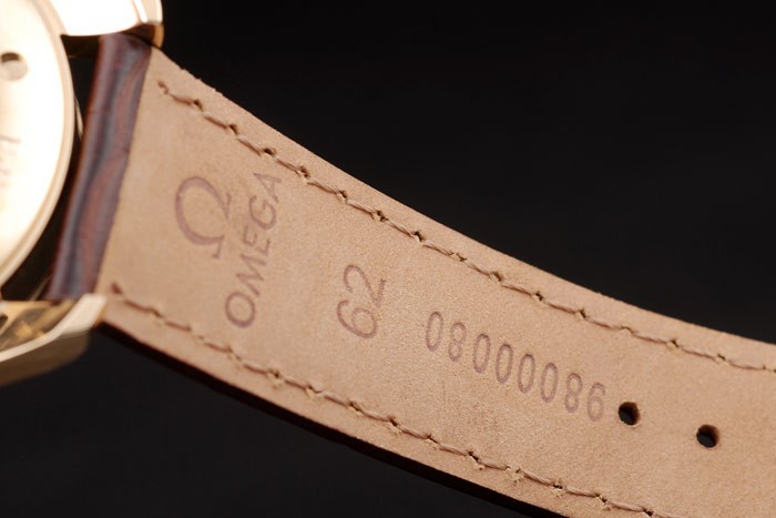 Bracelet: Brown crocodile leather strap with heat embossed Omega stamp and Omega inscribed 18k yellow gold fold-in clasp