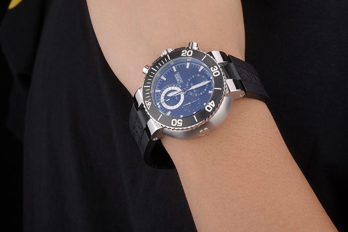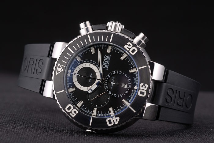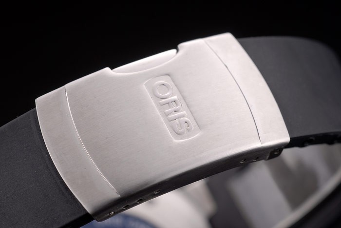 Bracelet: Oris heat embossed black rubber strap with Oris engraved brushed stainless steel deployment clasp