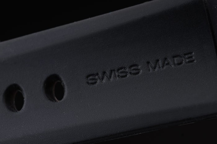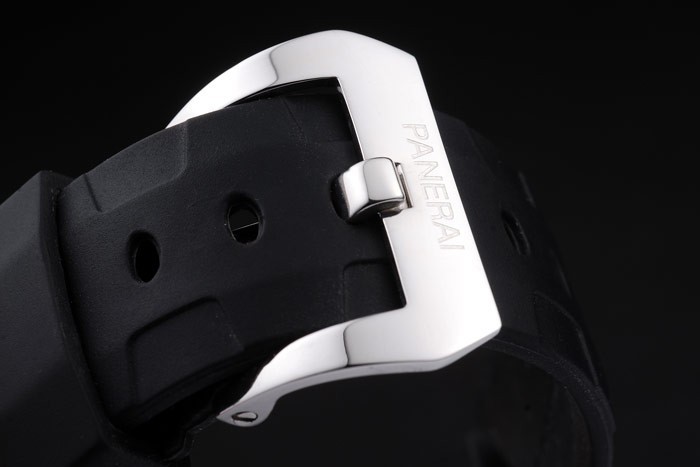 Bracelet: Black rubber strap with heat embossed Workshops Panerai strap and brushed stainless steel fold-in hook clasp