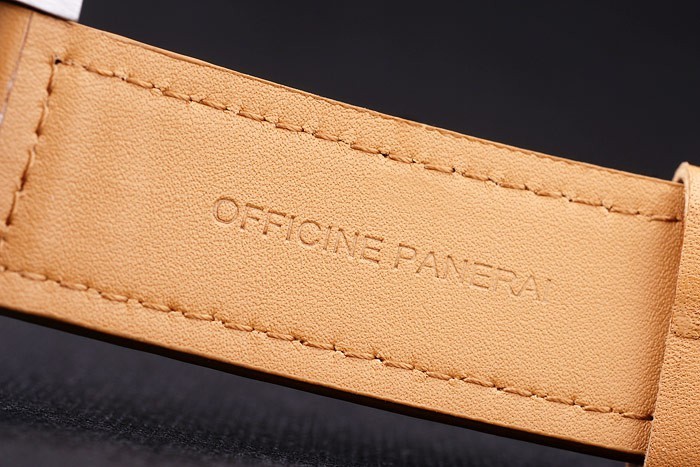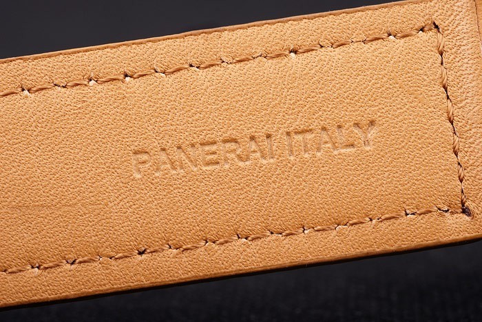 Bracelet: Heat embossed Workshops Panerai Italy stamped tan leather strap with stainless steel hook-buckle clasp