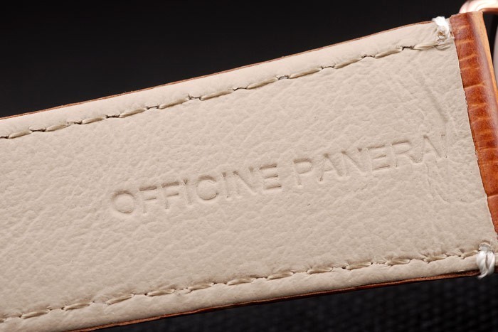 Bracelet: Brown crocodile leather strap with white stitching and heat embossed Workshops Panerai Italy stamp and 18k rose-gold plated hook-buckle clasp with Panerai engraving