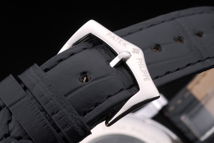 Bracelet: Black crocodile leather strap with heat embossed Patek Philippe stamp and polished stainless steel hook- buckle clasp with Patek Philippe engraving