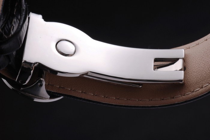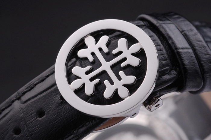 Bracelet: Black leather strap with Patek Philippe stamp and a stainless steel fold in clasp with Patek logo buckle