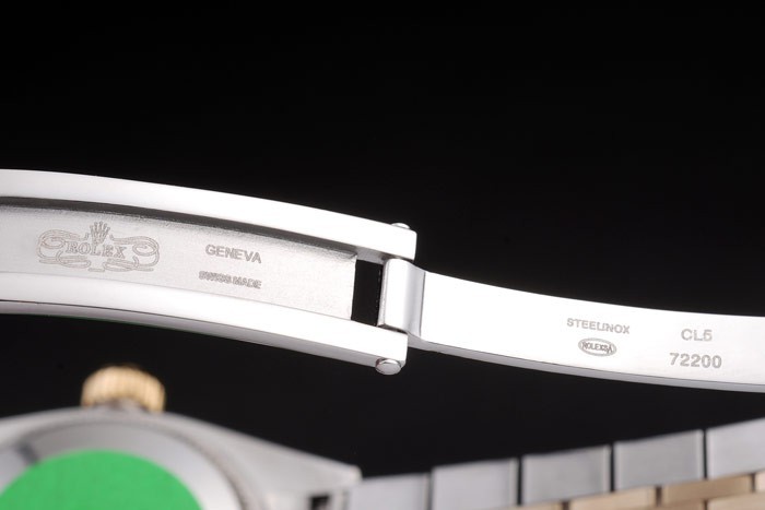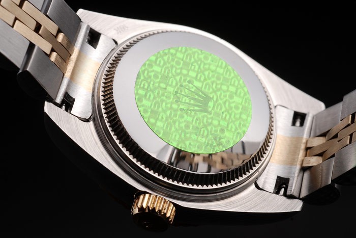Back: Stainless steel push-in case back with green Rolex logo stamp