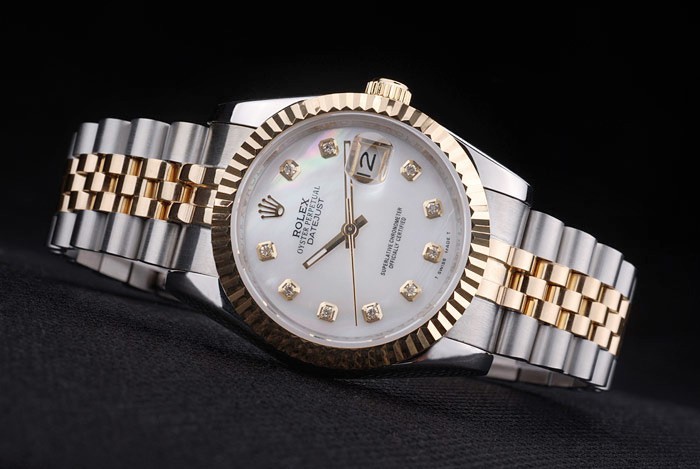 Bracelet: Two toned link bracelet in polished stainless steel and 18k yellow gold plated steel with Rolex engraving hidden clasp displaying the Rolex logo