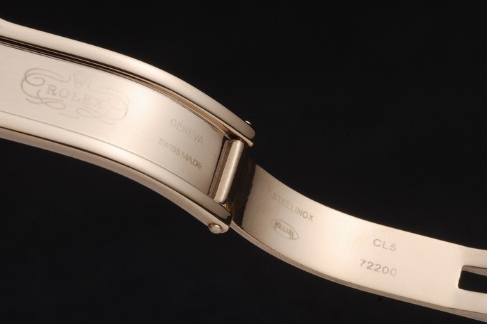 Back: 18k yellow gold plated stainless steel push-in case back with green Rolex logo stamp