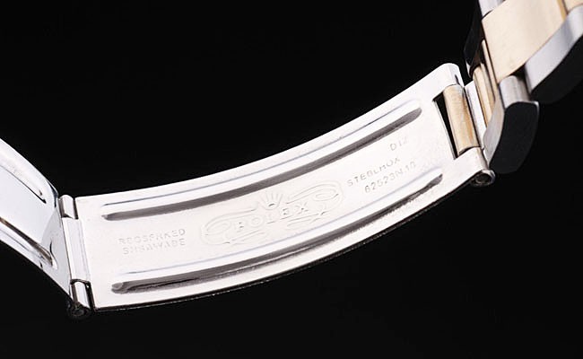 Bracelet: Two toned link bracelet in brushed stainless steel and 18k yellow gold plated steel with Rolex engraving fold- in deployment clasp displaying the Rolex logo