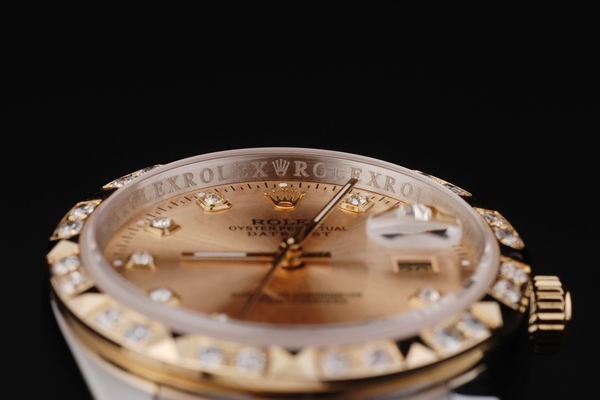 Bezel: Diamond studded 18k yellow gold bezel with black arrowheads marking the hours