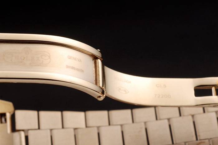 Bracelet: 18k yellow gold plated stainless steel link bracelet with Rolex engraved hidden clasp displaying the Rolex logo