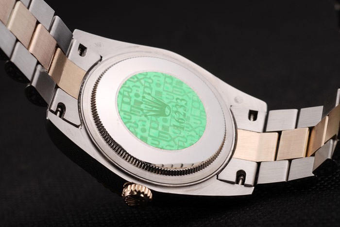 Back: Push in stainless steel back with green Rolex sticker and markings