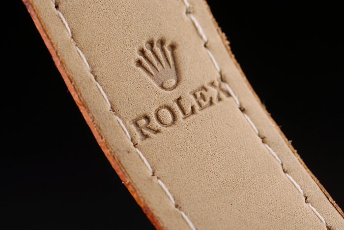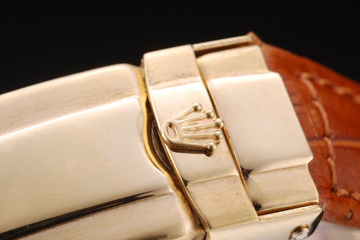 Bracelet: Rolex heat embossed brown crocodile leather strap with engraved yellow gold deployment clasp with Rolex logo on top