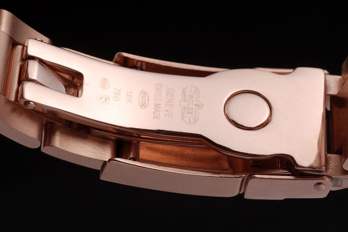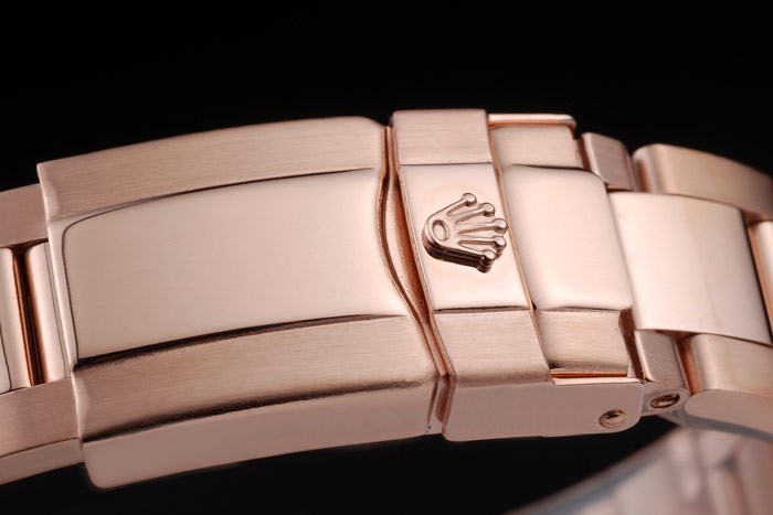 Bracelet: 18k rose gold-plated stainless steel link bracelet with Rolex engraved fold- in deployment clasp displaying the Rolex logo