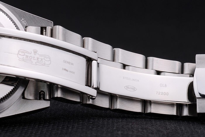 Bracelet: Brushed and polished stainless steel link bracelet with Rolex engraving fold in clasp displaying the Rolex logo