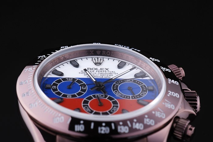Crown: Rosy brown stainless steel cutwork crown with Rolex logo and two smaller push-button cutwork crowns on either side of it