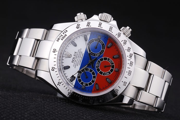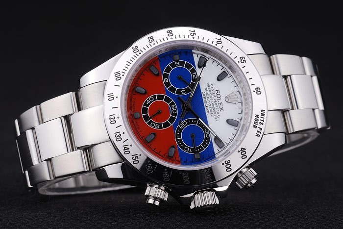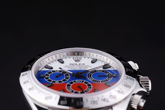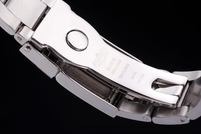 Crown: Polished stainless steel cutwork crown with Rolex logo and two smaller cutwork push-button crowns on either side of it