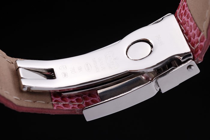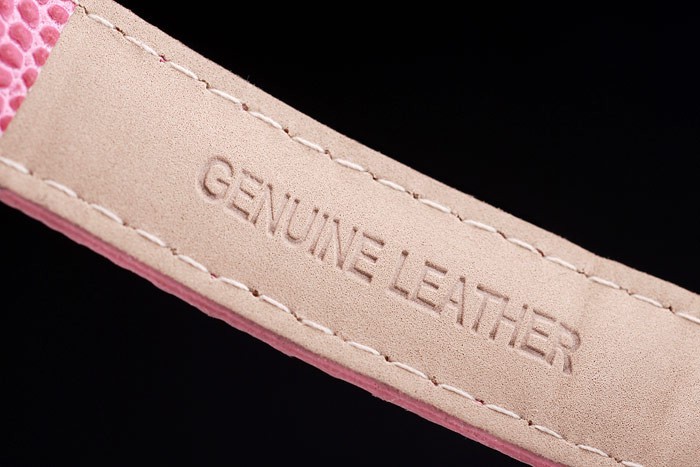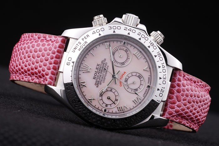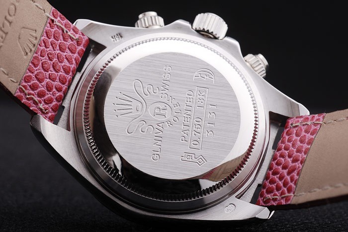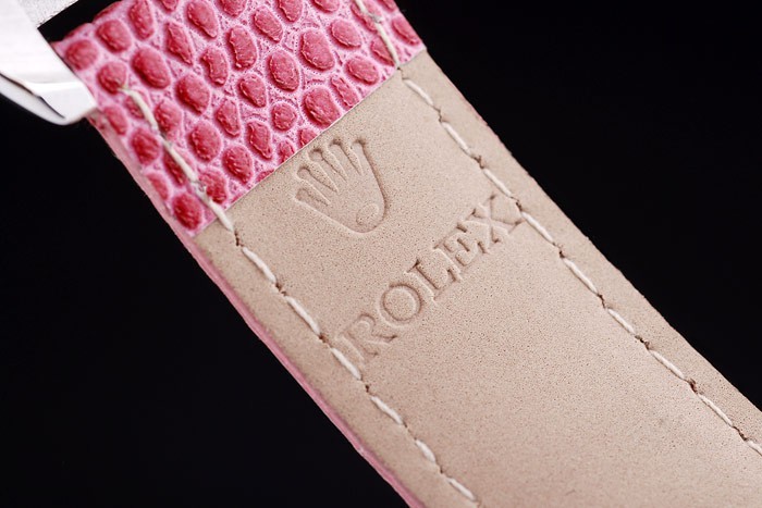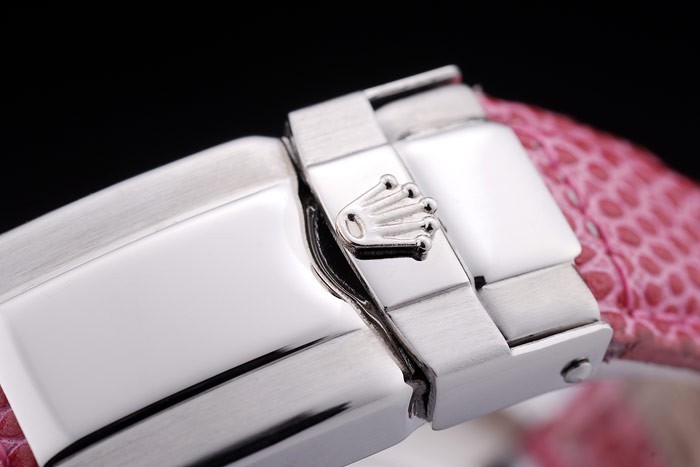 Bracelet: Rolex and logo heat embossed pink snakeskin leather strap with Rolex logo polished stainless steel deployment clasp