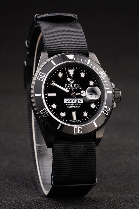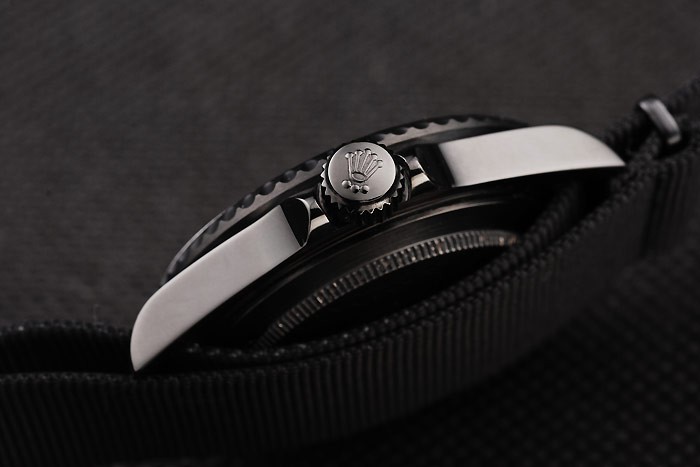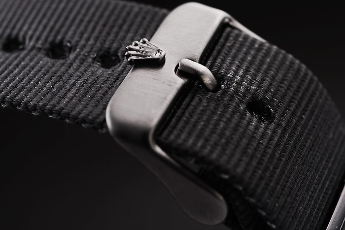 Bracelet: Black fabric strap with Rolex logo carved ion-plated hook buckle clasp